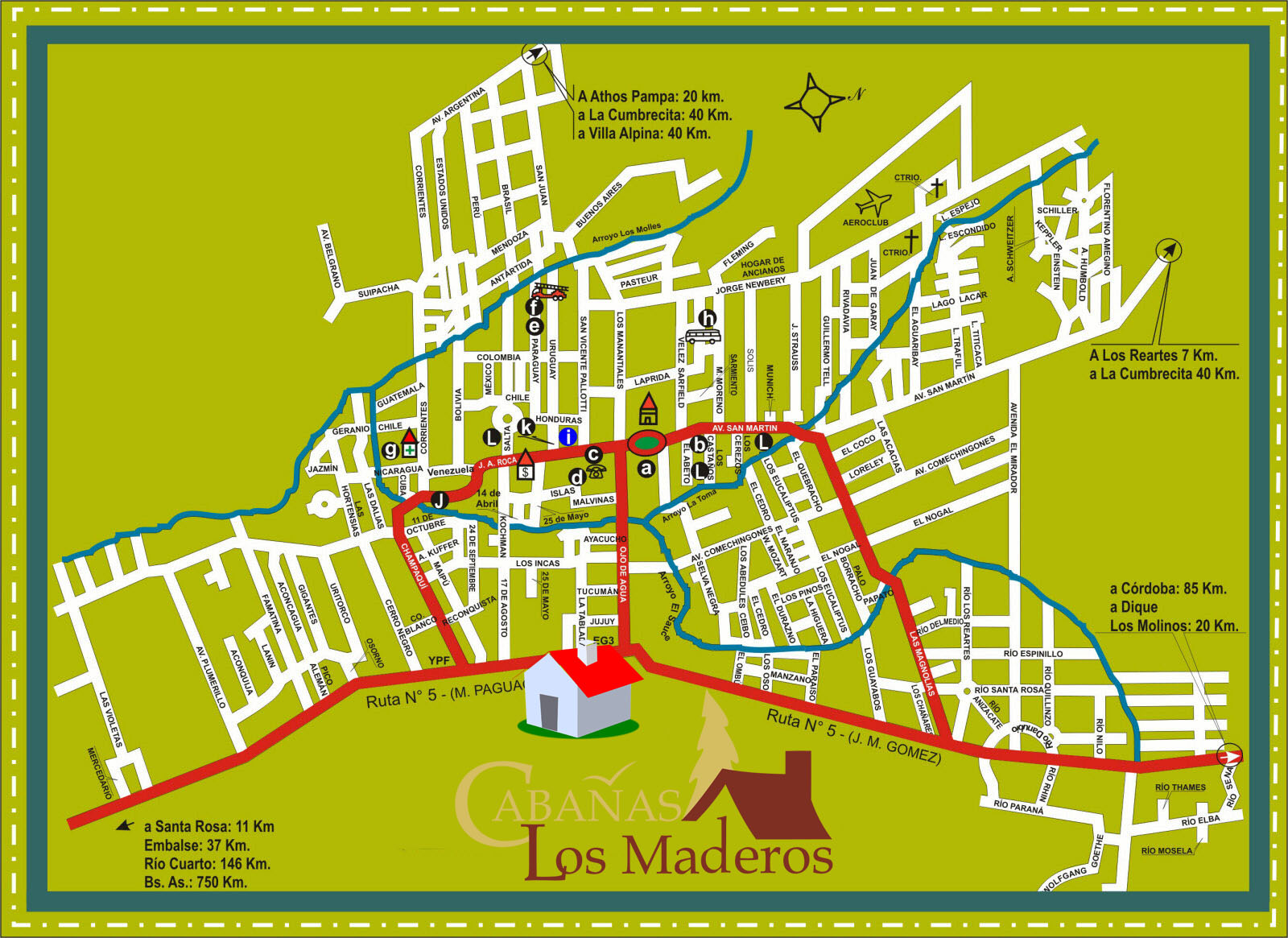 Estamos ubicados sobre la Ruta 5, en el km 79. A 5 cuadras del centro de Villa General Belgrano, a 2 cuadras de la calle principal 'Ojo de Agua'. Al pie del Cerro de la virgen.